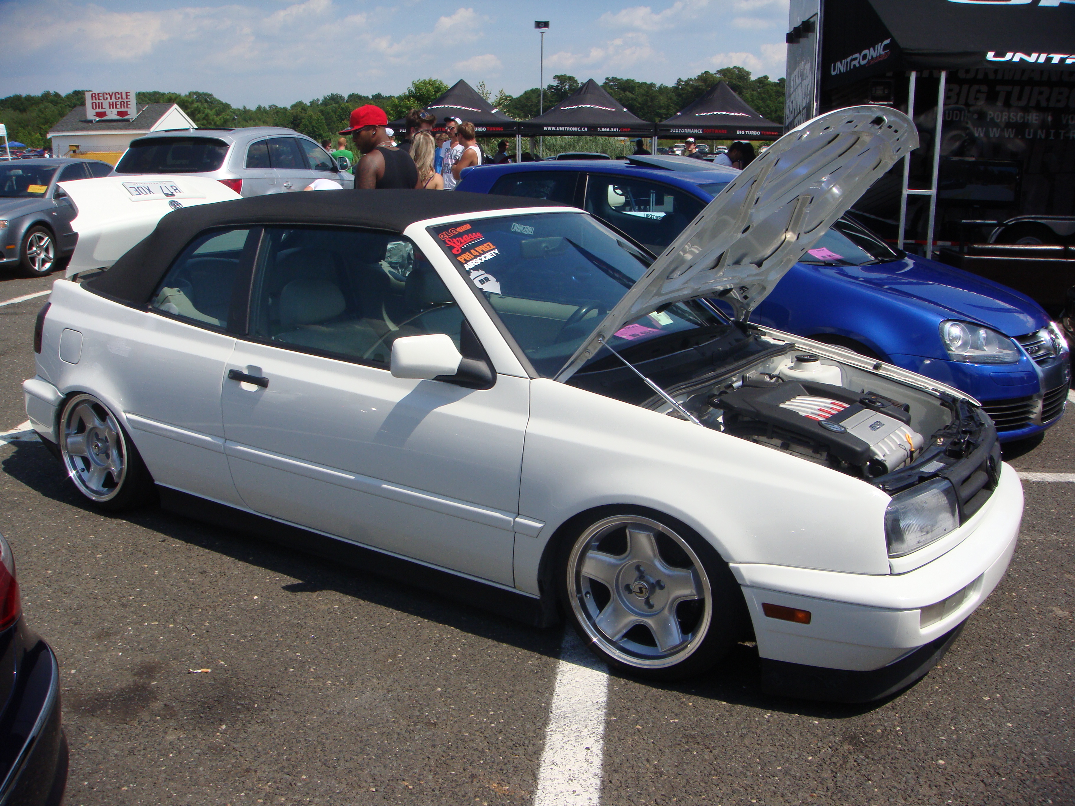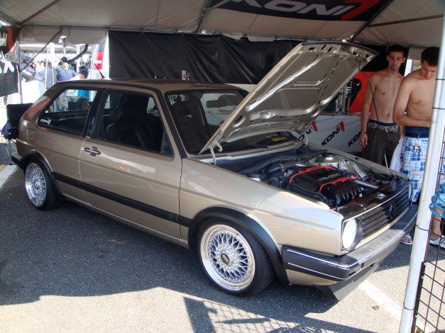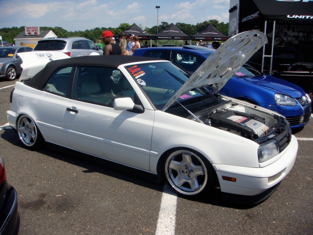 Very nice mk3 Cabrio on air sitting on a classic set of Schmidt wheels. Oh, the R32 powerplant was also a wise addition.